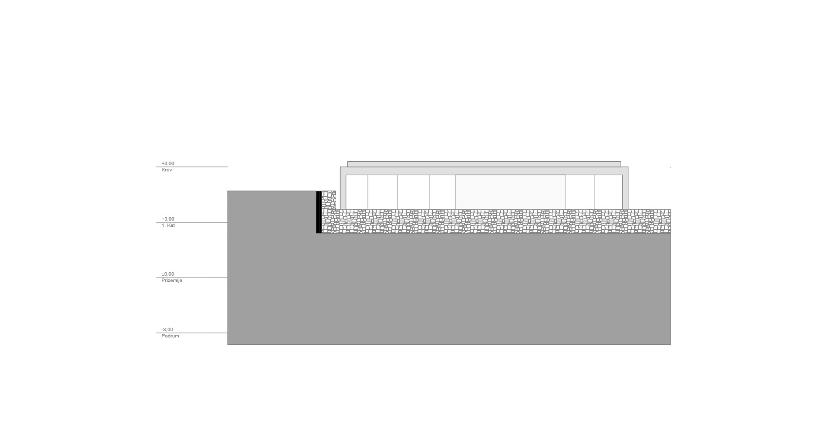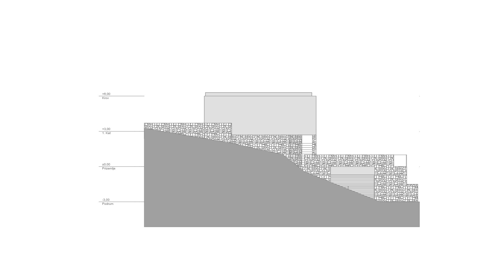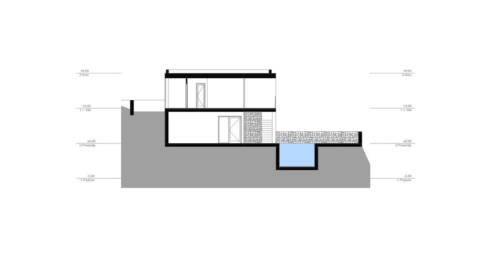 Obiteljska kuća urezana je u teren te se sastoji od podruma sa servisnim sadržajima, prizemlja otvorenog dnevnog dijela i kata sa privatnim spavaćim prostorima. Organizacija prostora omogućuje maksimalno korištenje prirodnog nagiba terena i otvara poglede prema moru i okolnom krajoliku.