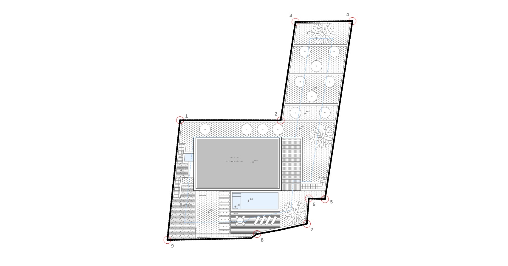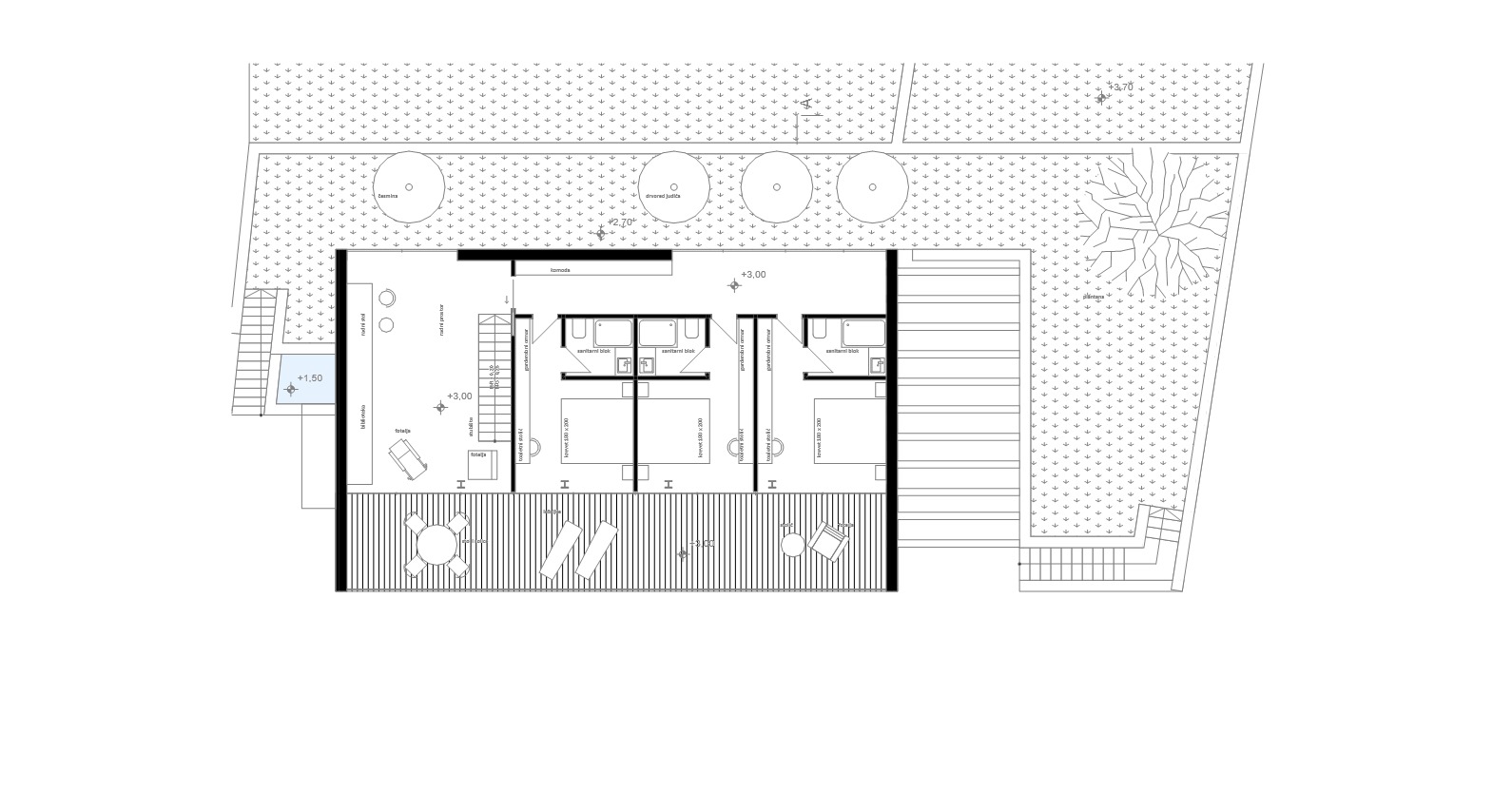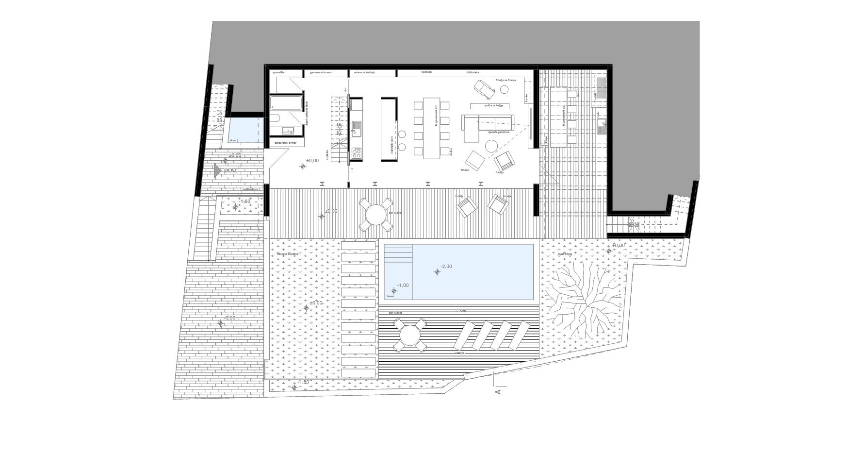 Obiteljska kuća urezana je u teren te se sastoji od podruma sa servisnim sadržajima, prizemlja otvorenog dnevnog dijela i kata sa privatnim spavaćim prostorima. Organizacija prostora omogućuje maksimalno korištenje prirodnog nagiba terena i otvara poglede prema moru i okolnom krajoliku.